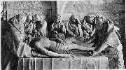 "We worship Thy passion, O Christ......" Great Holy Thursday Evening (The service of the HOLY PASSION of our Lord Jesus Christ. ) Good Friday celebrates the holy, saving and awesome Passion of Christ. To take away our sins, Christ willingly endured the spitting, scourging, buffetings, scorn, mocking and the purple robe; the reed, sponge, vinegar, nails, spear and, above all, the Cross and Death. The confession from the cross of the penitent thief, crucified with Christ, is celebrated. This service is long, but its content is dramatic and deeply moving for the devout Christian. Participation in the prayers and the historical sequence of the events, as related in the Gospels and hymns, provides a vivid foundation for the great events yet to come. Following are the references of the "Twelve Gospel" readings of this service: |